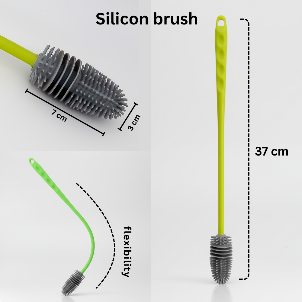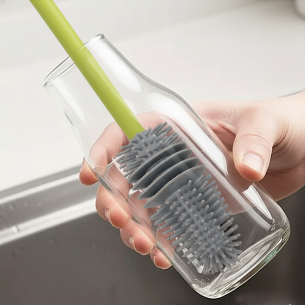 The 37 cm long handle easily reaches deep into narrow-neck bottles and tall jars, making it ideal for cleaning baby bottles, water bottles, coffee mugs, glass jars, milk bottles, and wine glasses. The soft yet durable silicone bristles flex to reach every corner, removing dirt, stains, and residues effectively without leaving any scratches.
