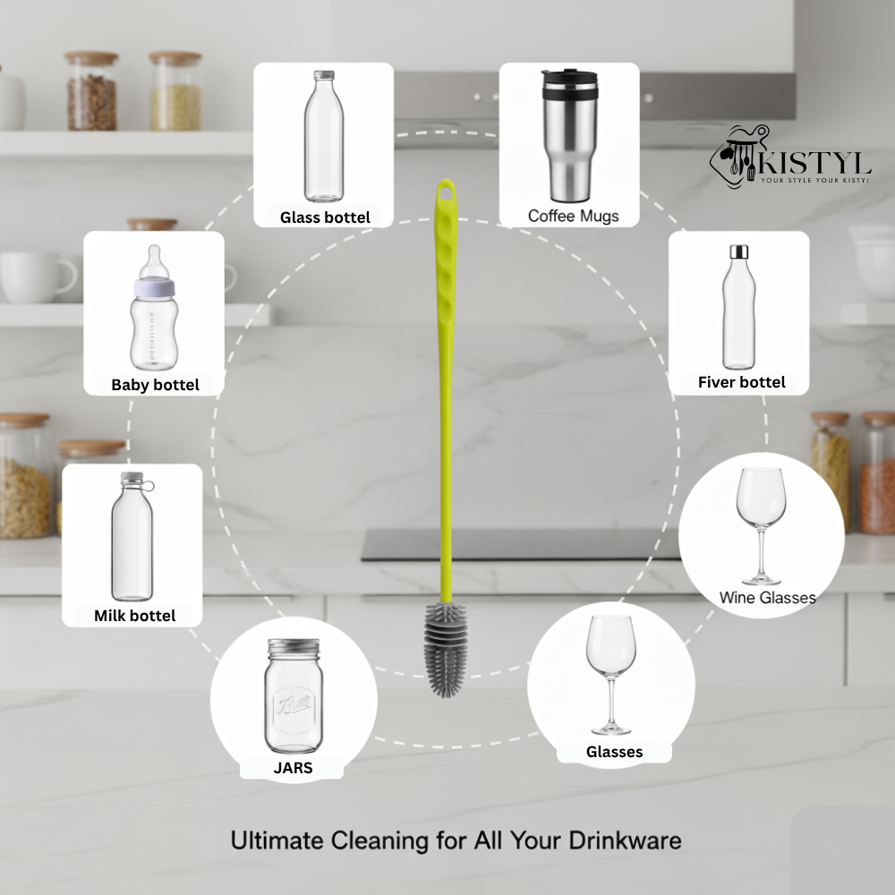 Keep your drinkware spotless with the KISTYL Silicone Bottle Cleaning Brush, designed to make cleaning effortless and hygienic. This smart kitchen tool is crafted from premium food-grade silicone that ensures safe and scratch-free cleaning for all types of bottles, jars, and glasses.